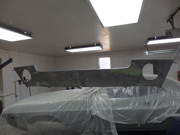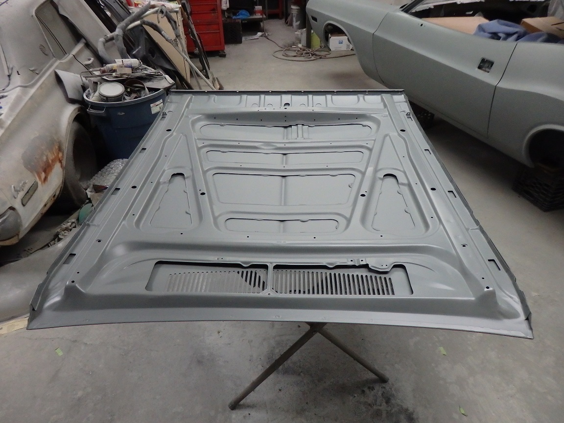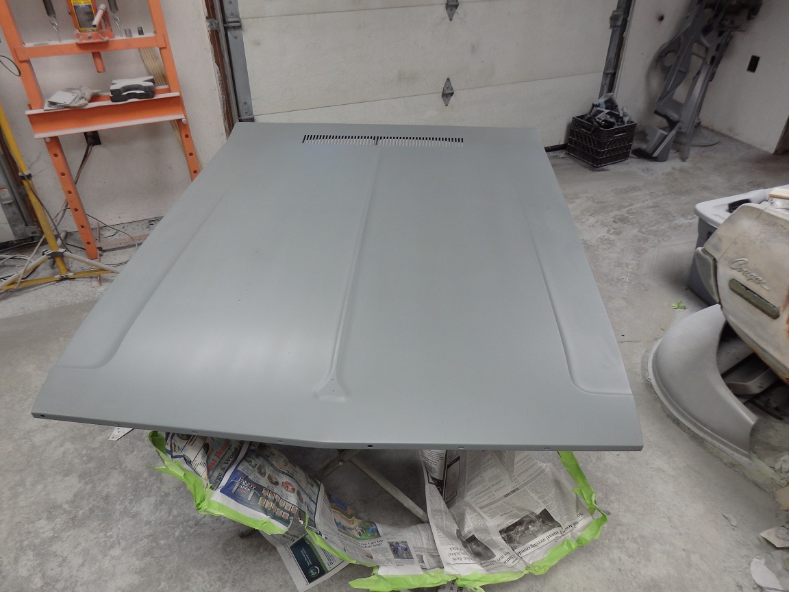 193) Here it is with 3 coats of DP40LF Epoxy primer and ready to install on the car. The hinges only needed to be sandblasted and primed. I removed the springs from the hinges primer to priming. I gave them 1 coat with the hinges closed and another coat with the hinges opened.