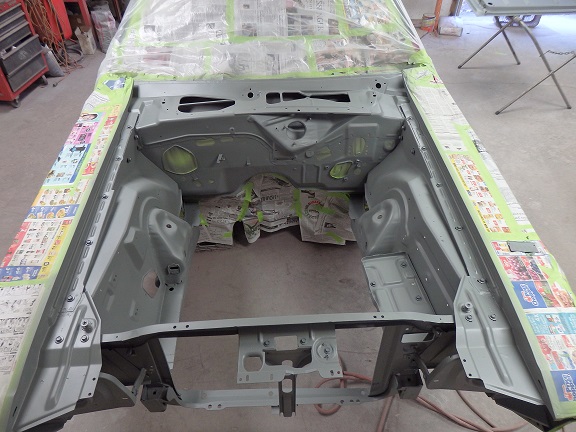 229) The next thing the factory did was to coat the outside panels with red oxide primer. This was baked on and then the outside panels were coated with a light gray primer prior to painting. To replicate this I shot DP74LF along the masked rocker panels to simuldate the overspray. Then I shot some tinted DP40LF to match the factory gray.