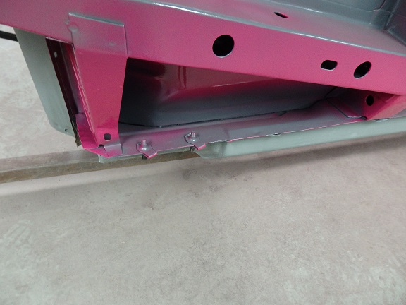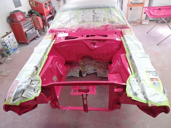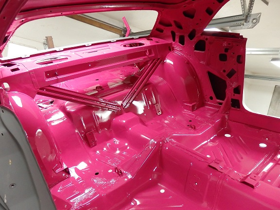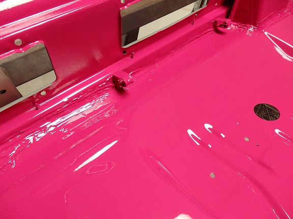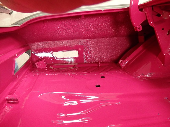 230) Lastly the undercarriage was oversprayed with Panther Pink paint. I tried to replicate what the undercarriage overspray actaully looked like for this car. Technically I'm not done with the undercarriage. Originally the rocker panel pinchwelds were blacked out producing some black overspray over the pink. I am holding off with the blackout until the car is fully painted and buffed. Then I will apply the backout for the radiator support, windshield opening and rockers all at the same time.