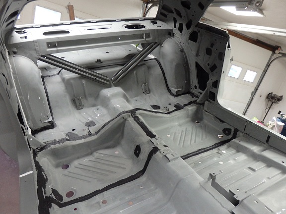 The rest of the interior floor was sealed with Black Jack Neoprene Super Flash Cement, which I bought at Lowes. It replicates the original factory sealer very closely and is easy to work with. I used 4 tubes to do the entire car.