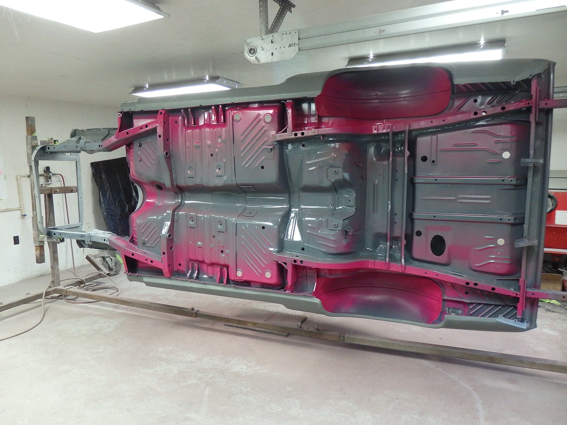 228) And at last there was paint! Originally the factory would have dipped the car half way up its side in a vat of water soluable gray primer (dip gray). The primer on the outside of the car was then hosed off before the primer was baked on. In the end the primer is only visibly from the undercarriage.