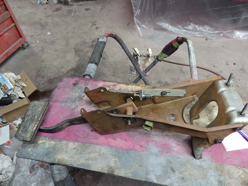 280) The pedal support was dismantled and the major steel pieces were soaked in phoshoric acid overnight. After soaking the parts were soaked in a baking soda solution