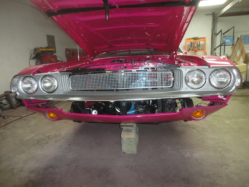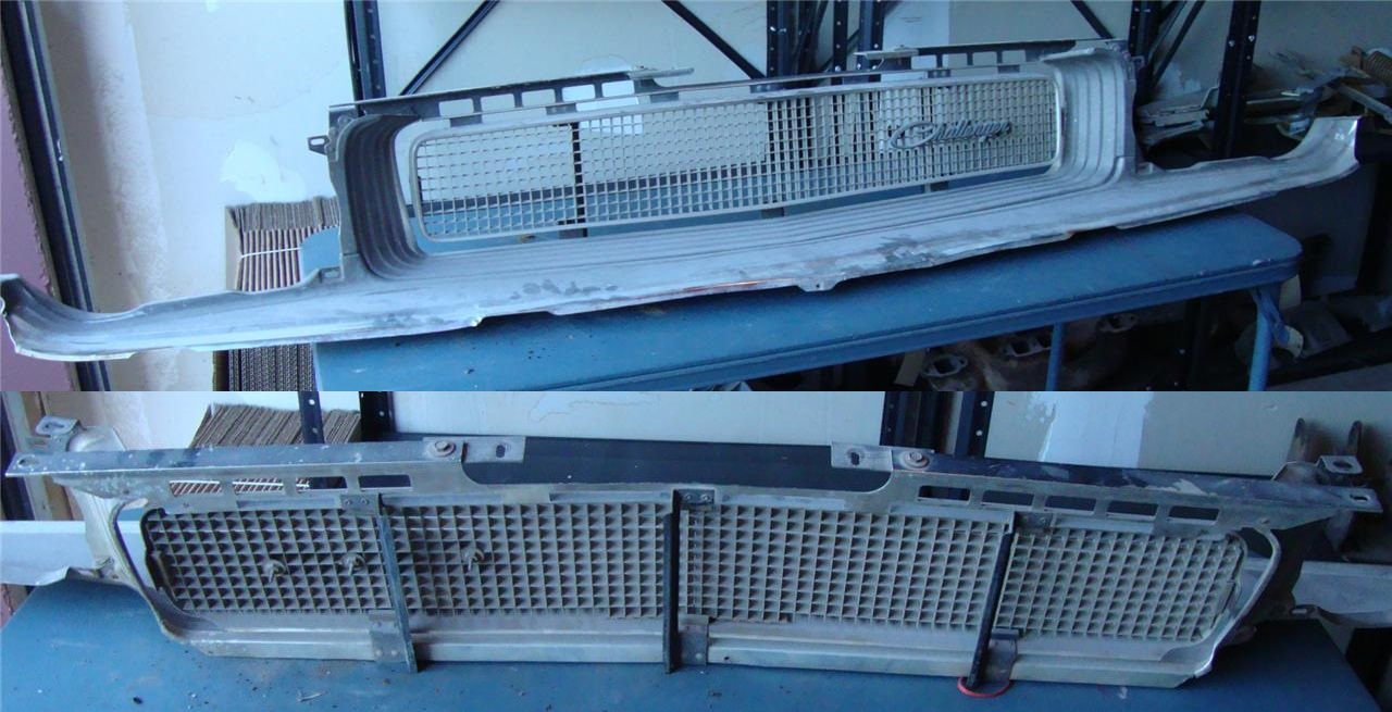 384) I was able to rebuild the grill with new repo pieces that I got from Roseville Moparts. Luckily I had the missing bracket on the original hood latch support.