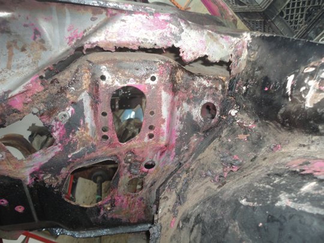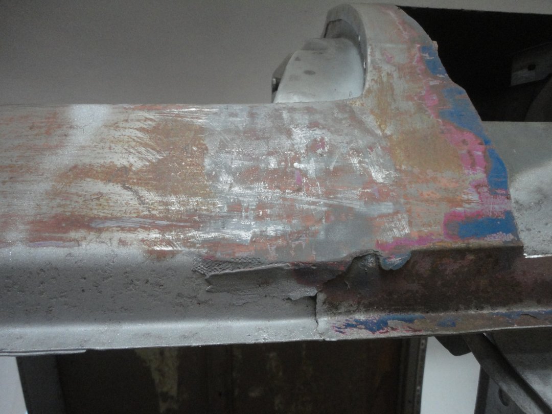 9) The first actual repair was the area shown here on the left rear frame rail. I had to cut part of the rear reenforcement off to get to one