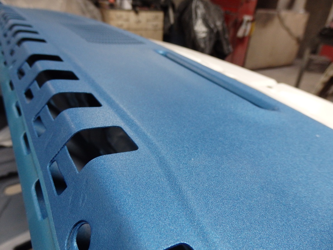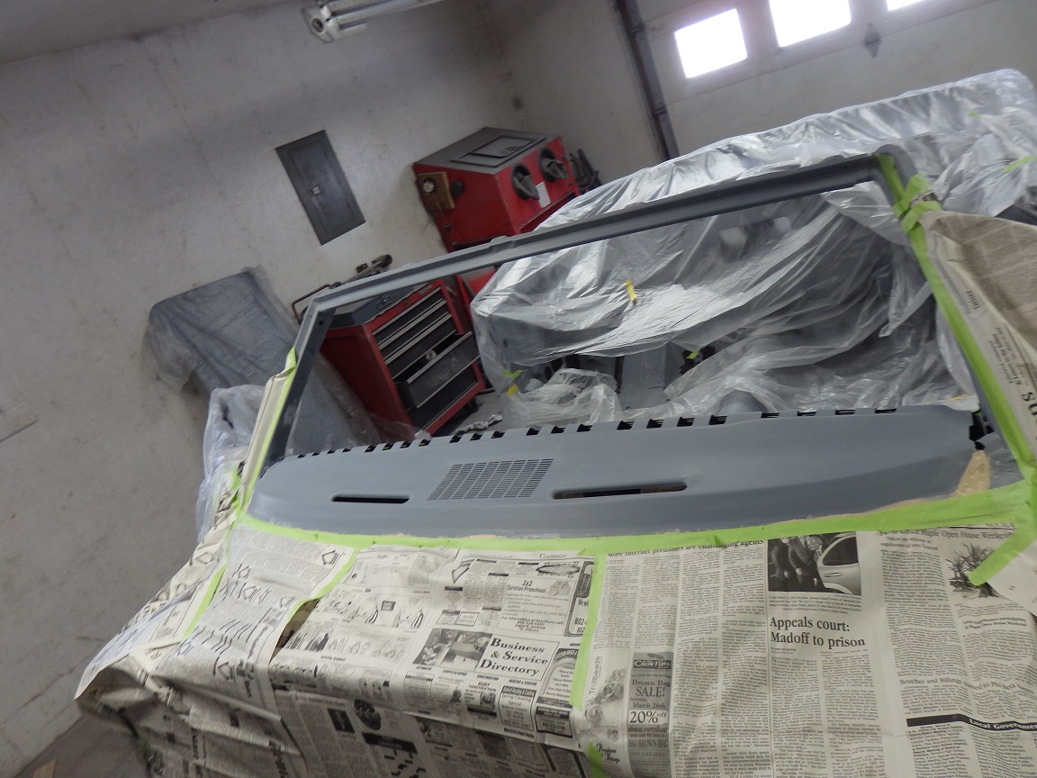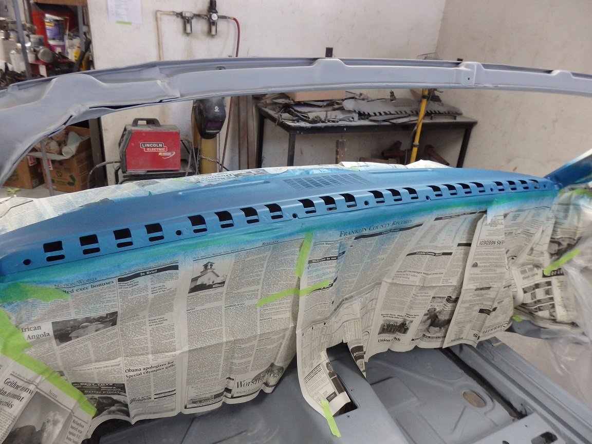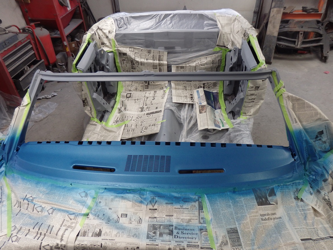 With the body off the rotisserie, the finish paint work could begin starting with the dash top. The top of the dash is PPG 13217, which is a dark blue lacquer paint with a suede additive. This could not be bought local anymore since lacquers are a thing of the past. However, I was able to have a pint mixed Instrument Specialities. I think the color came out great. It is a darker blue than the rest of the interior paint. It is supposed to match the dash pad, which is also darker than the rest of the interior. The suede additive gives the paint a nice texture and it holds down the glare. |
