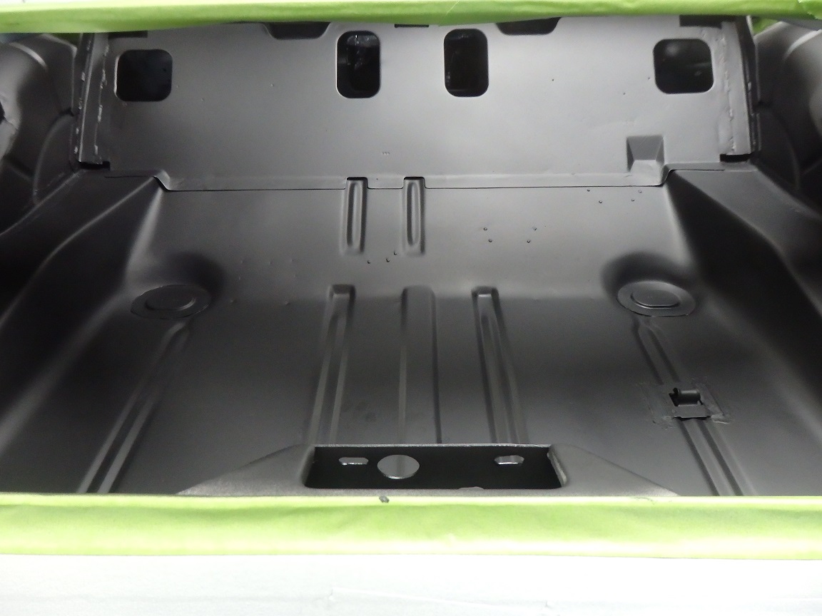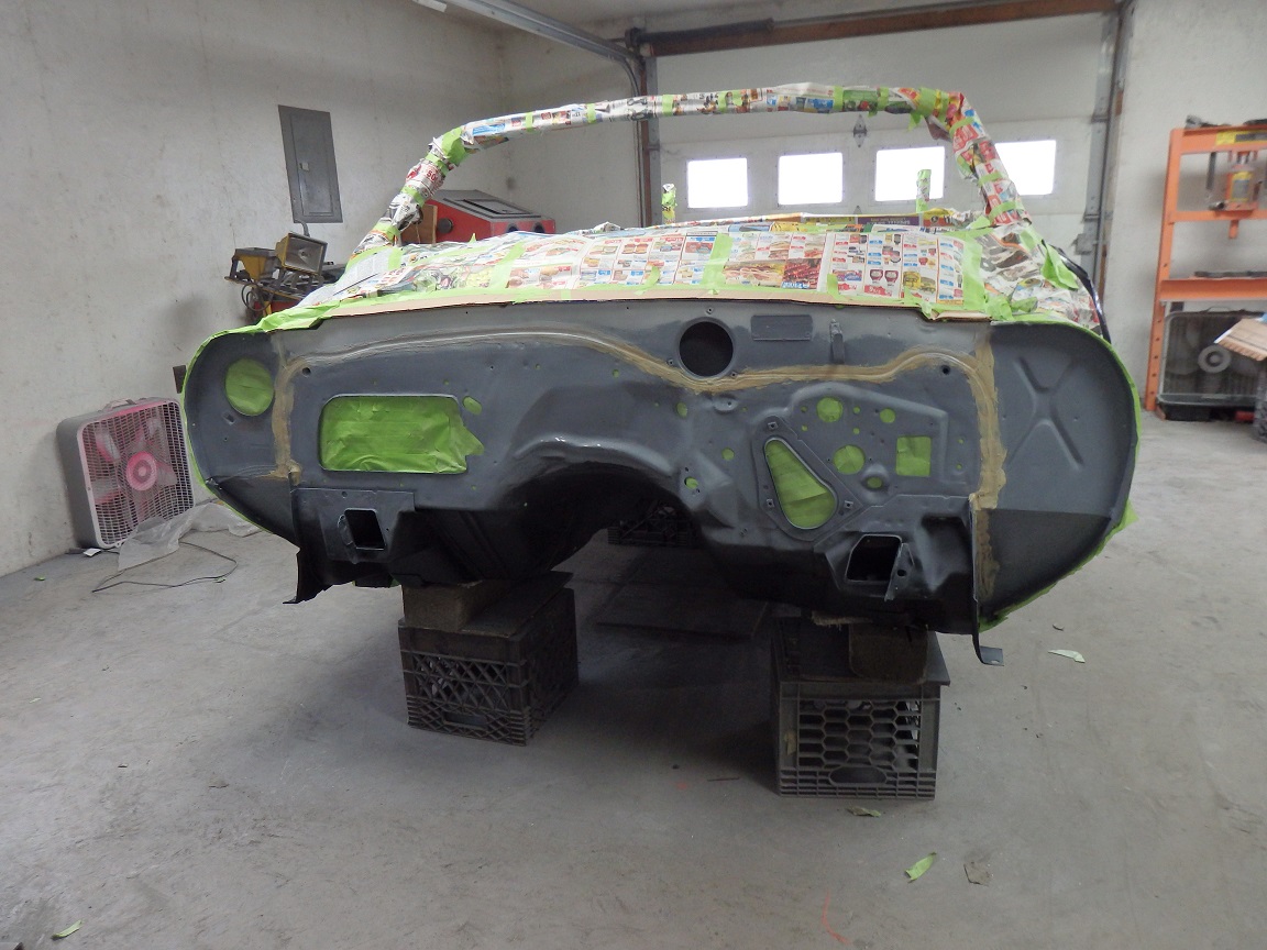 The factory blacked-out the firewall after the car was painted, I wanted to get that out of the way earlier to keep the black dust out of the garage before painting the car white. With the doors installed I painted the cowl top and sides along with the inside faces of the doors. This produced a factory correct look on the door hinges without having mask lines. Also I didn't have to risk damaging the paint by installing the doors after the car was painted. The factory never masked the firewall when they blacked it out. So no mask lines should appeared at the top of the cowl. The black paint appears misted over the body color on original cars. The way I did it was to mask off all of the white except for the top of the cowl. I loosely taped down a piece of cardboard over the top of the cowl. I then painted the firewall. At the top of the firewall, I painted downwords so that paint would kind of fan out under the cardboard a little bit. This method seemed to work out well. |