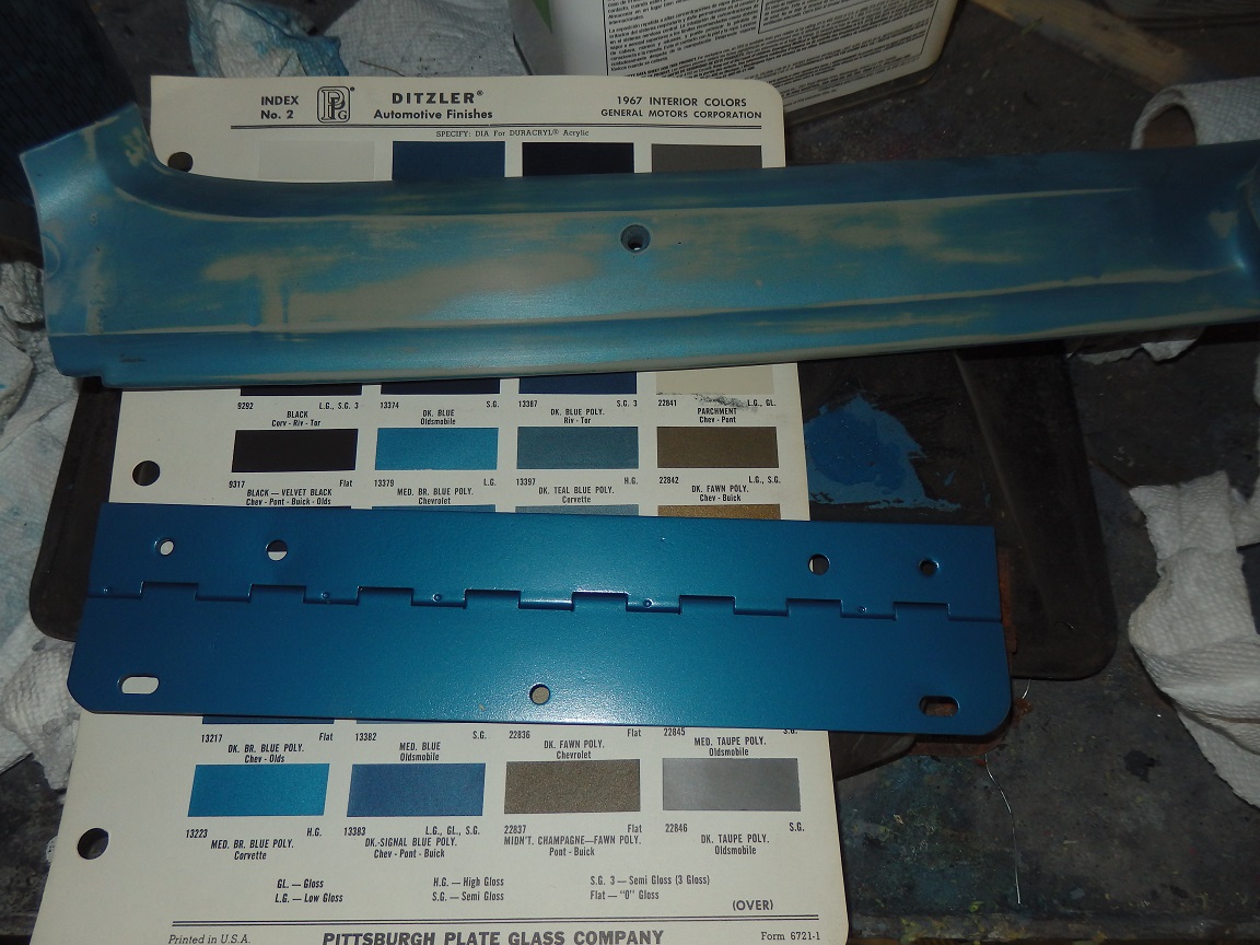The next thing to get painted was the dash face and the top of the door and rear quarter frames. This is supposed to be PPG 13379, which is a medium blue that is lighter than the interior upholstery. I ordered a pint from Instrument Specialities and applied the paint, but probably shouldn't have. As it turned out the paint was the wrong color as you can see in the first 2 pictures. The first pictures shows an original trim piece, the PPG paint chip for 13379 and the glove box hinge I painted. The new paint didn't match the chip because it was mixed to the old formulas that were never updated when the newer lacquer pigments were updated. Instrument Specialities tried to help, but it was taking longer than I had time for. Luckily OER interior lacquer paint PP804 was close enough to the original color. Unfortunately it only comes in aerosol cans, which don't really spray out onto large panels very well. What I did to over come this was drain 4 aerosol cans into a pint can by poking holes in them. Then I was able to respray everything with my paint gun. |