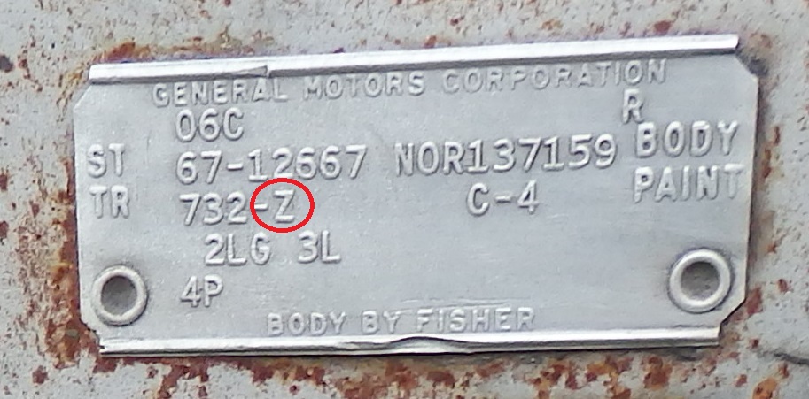 The code next to "TR" (for trim) tells you about the type of seats the car came with. "732" is the code for bright blue custom bucket seats. The "Z" indicates that the seats did not have