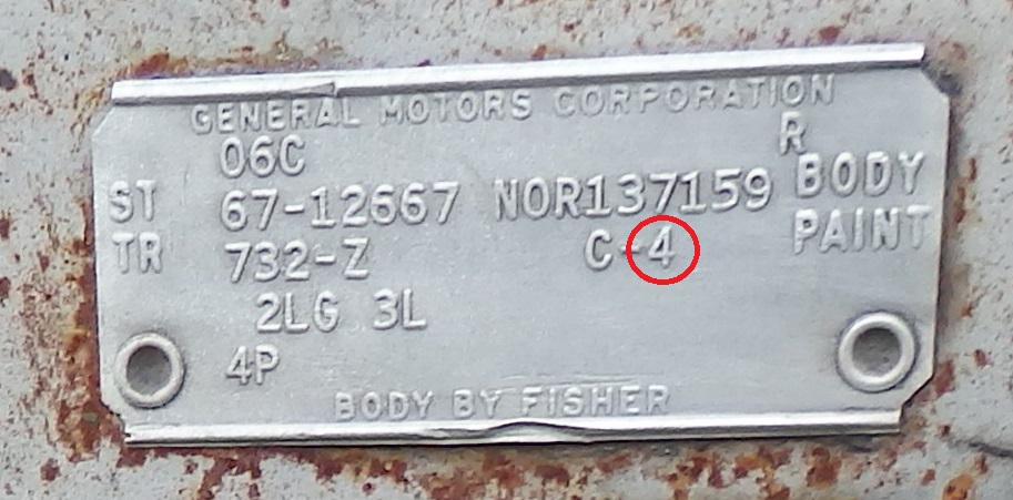 And finally the group 4 option, signified by the number "4" followed by the letter "P", which indicates that the car was originally equiped with an SS-350 (RPO L48) or the 327ci-275HP w/ Saginaw 4-speed transmisison (RPO L30/M20).