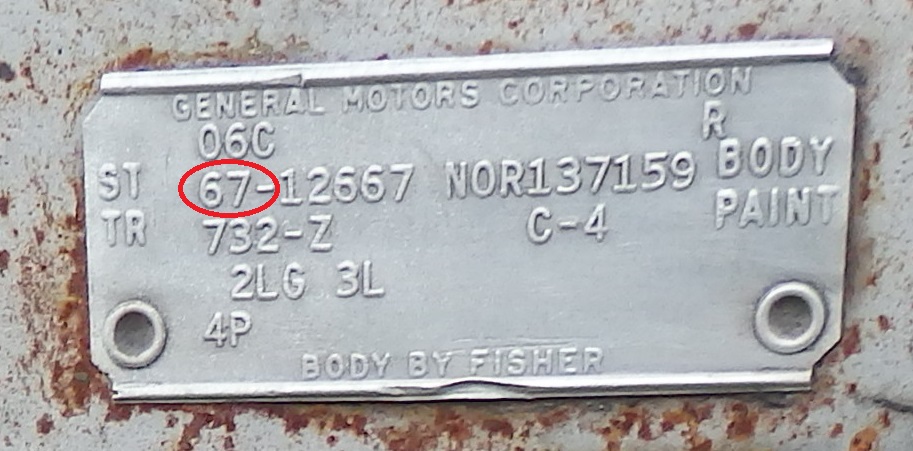 The code next to "ST" tells you about the type (or style) of car it is. The first 2 characters "67" represents the model year (1967). The first 2 digits "12" after the "-" indicates