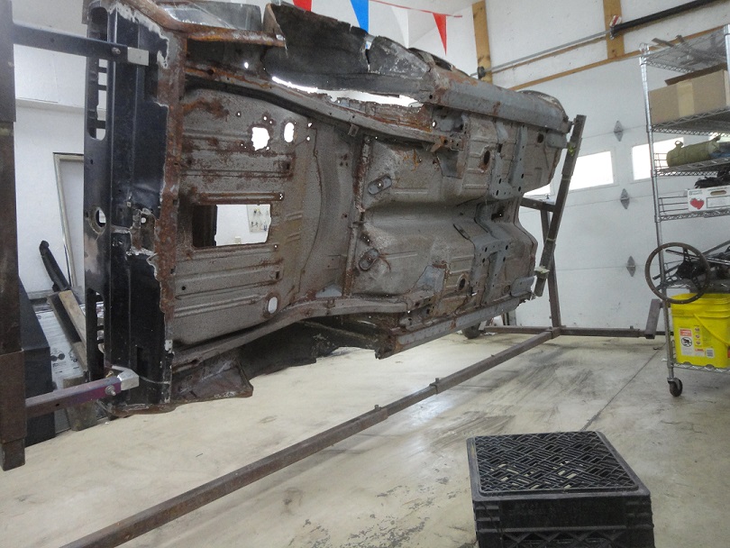 The second picture is what it first looked like when I put it on my rotisserie 2 years later. In this picture I had removed the frame reinforcements that were welded in to stiffer the car for drag racing.