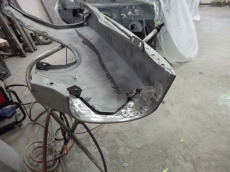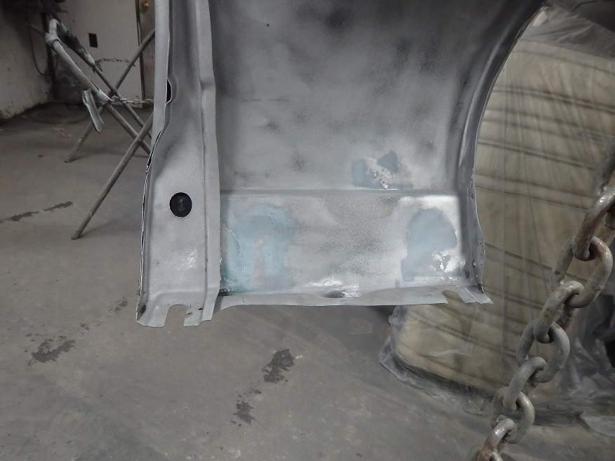 of, which was uncovered after sandblasting. To fix it , I purchased an AMD lower fender repair panel and butt-welded in only the section I needed. The repair panel had the correct