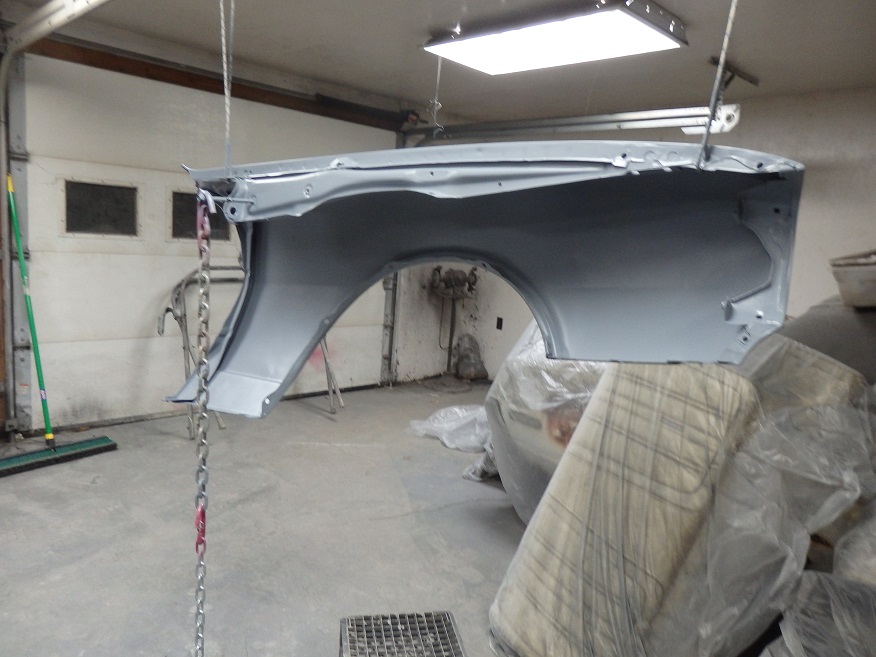 With the filler work completed, I hung the fender from the ceiling and epoxy primed the whole thing.