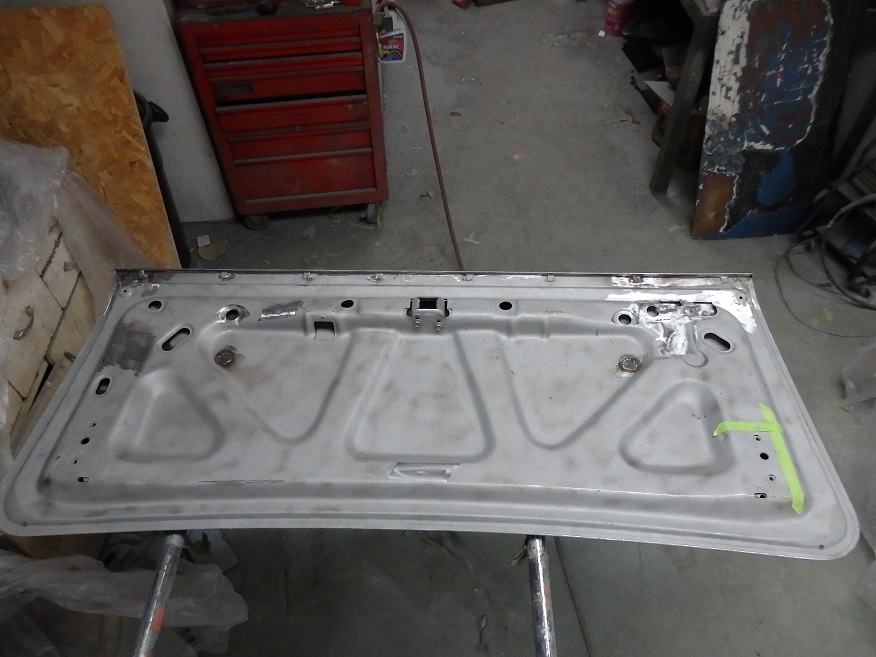 access holes (top right corner). I had also started welding up the spoiler holes. In the third picture I had completed all of the welding. Now it looks like the late-67 trunklid style (introduced Feb/March 1967).