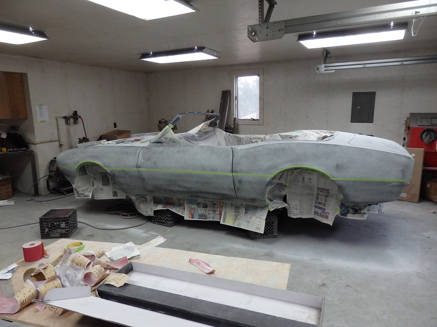 With blocking done, I primed the car with DP50LF Epoxy primer again. This time I added a little more reducer so that the primer would lay down flatter. Basically it was mixed as a sealer. At this point the car looks great. There are no defects that need repairing. It is simply sand and paint. Though that has it own challenges. |