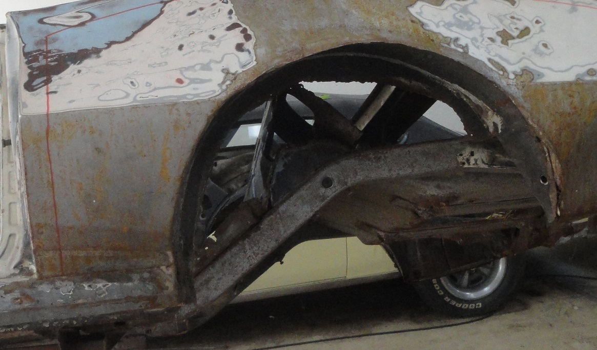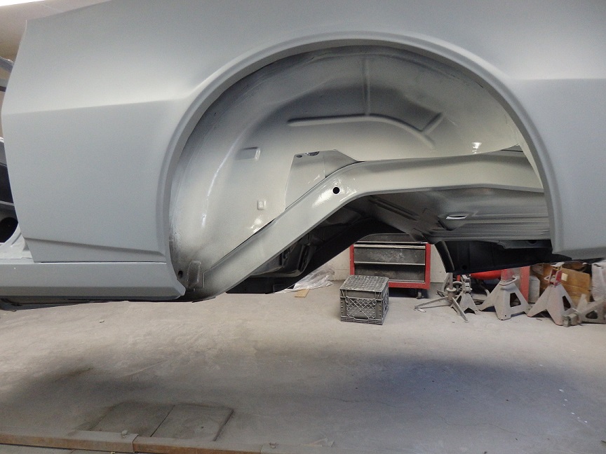 After allowing the black to dry for a day, I oversprayed DP50LF gray epoxy primer along the perimeter of the bottom. The factory would have hit the rear frame rails and inner wheel houses with gray primer similar to what is shown in the first picture. Some cars may have recieved a healthy dose of gray primer down the transmission tunnel from the front, but there was no evidence that this car had any. I oversprayed body color over the undercarriage a little while later. I actually did this as a basecoat/clear coat process. After a day I sprayed the rocker blackout overspray on to the undercarriage. I tried to mimic the way it was done at the factory. In the second picture you can see that I got a lot more black on the masked rockers than the undercarriage. That's because I had to mimic painting the rockers in order to get the overspray right. I finally oversprayed the undercarriage with black paint from the firewall (compare the 2nd and 3rd pictures). This mess or a version of this mess is probably what the car's undercarriage looked like from the factory. Some cars would have had more or less overspray than this. This is probably why people stuck with all black. There would not have been any overspray if GM had masked the lower parts of the cars when priming and painting them. The last picture shows the left rear wheel well. This would be the correct look prior to applying undercoat. Just think when I first got the car I could see right through the otherside of it. |