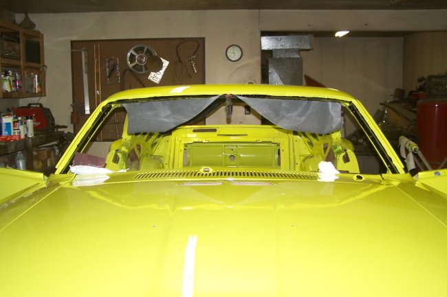 11) Along the bottom of the winshield, about 1/4 from the bottom, Ford applied a long strip of rigid foam. Perhaps it was there to divert water. You will have to make a new one.