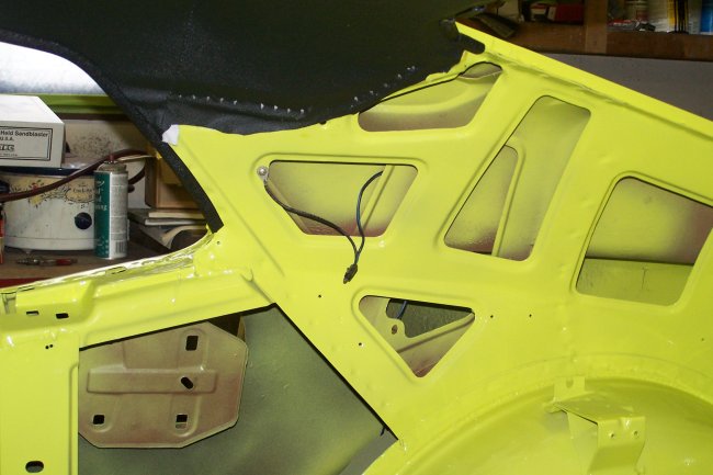 Next comes the sailpanels, but first the wiring for the sailpanel lights must go in. On the right side of the car (fastback only) there is a seperate wire that goes from the light, over the RH rocker panel and plugs in under the dash at the RH underdash light. The left side has a short harness that plugs into the main rear harness back towards the trunk. So you don't have to install the entire tail harness at this point if you don't want to.
