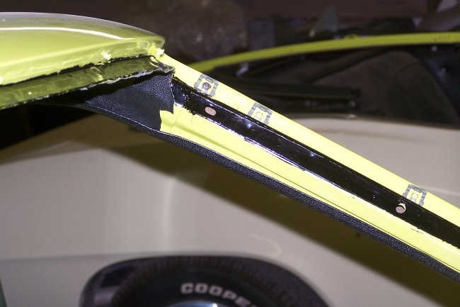 5) Because this is messy I apply 2 1/2" masking tape along the entire inside portion of the weather seal and the underside of the window opening inside the car.