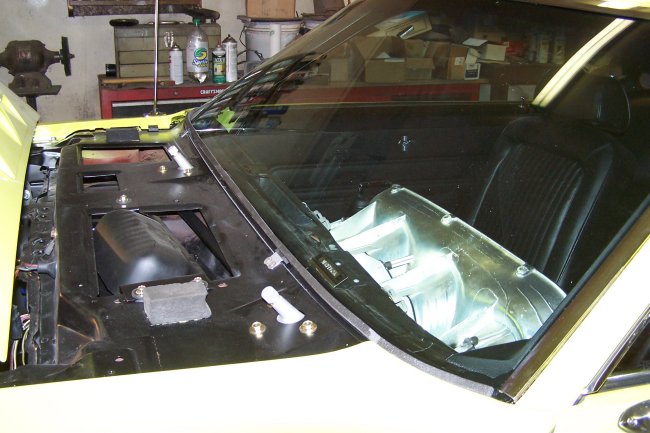 Here is a picture with the lower windshield seal in place. I made it from a 5 foot long piece of rigid black foam, which was cut 1/4" wide. Also visible in this picture are the two large foam blocks that are glued in place on the upper cowl. These help hold up the upper filler panel.