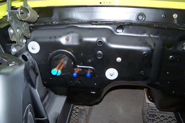 The last thing to get done on the firewall was to properly fit the carpet and install the drain hose for the AC. I cut the hole though the carpet and underlayment from