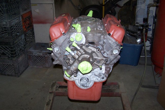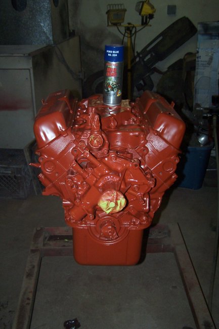 After the primer had set for a couple hours, the engine was then painted using Plasticoat Ford #224 engine paint. It took me 4 cans to do the engine and the breather.