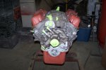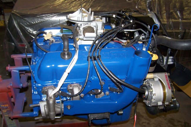Here's the engine with everthing installed, except the dipstick tube. The waterpump is a rebuilt original. The rear vacuum tree, the temp sending unit, the water neck and the thermo vacuum switch