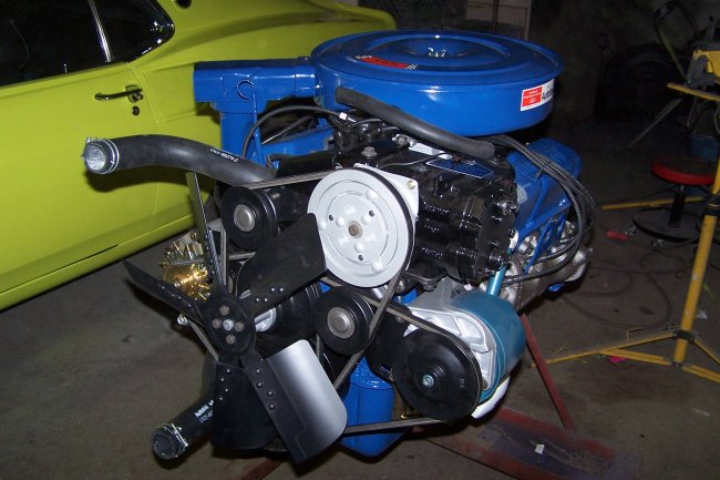 Here it is waiting for the AC pump and pulleys to be installed. I bought all of the parts from a guy who pulled the system of his 69 Cougar, which had a 351w. It cost me $100 for everything. Unfortunately