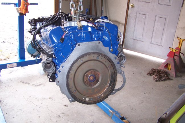 get damaged during the engine installation. With the engine in the air, I installed the rear engine plate and the flywheel.