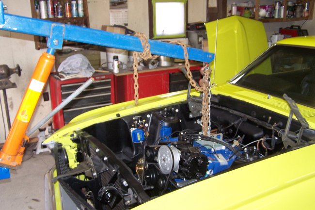 I temporarily wrapped a chain around the tailshaft to hold it level. Once the engine was positioned over the engine compartment, the chain was released. Then it was a matter of gradually lowering the engine a little and then moving the engine