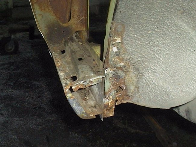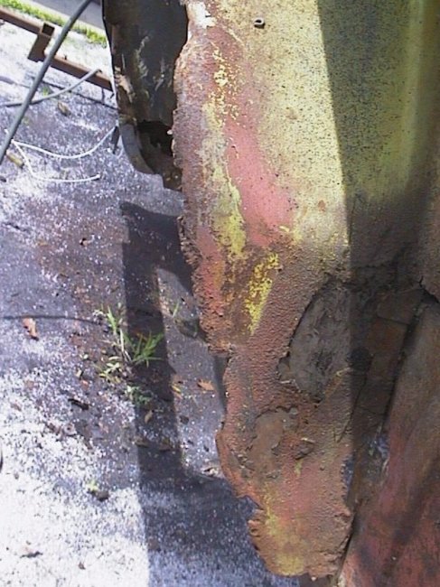 When the outer wheel well is removed from the rocker panel it is not uncommon to uncover a rust hole. This hole can usually be seen from inside the car in the back seat area before the outer wheel well