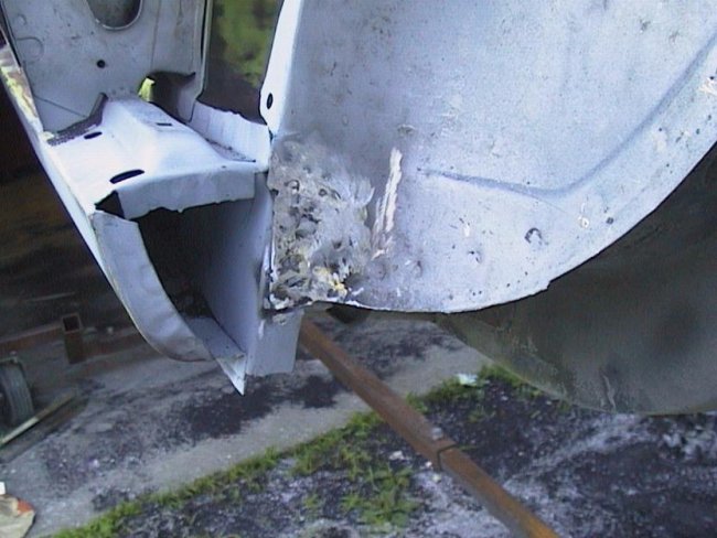 This can be easily repaired by cutting out the rust and butt-welding in a new piece. It should be noted that no only is the new piece butt-welded in, it is also plug-welded to the inner rocker panel and to