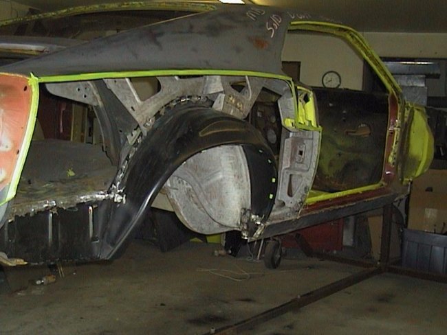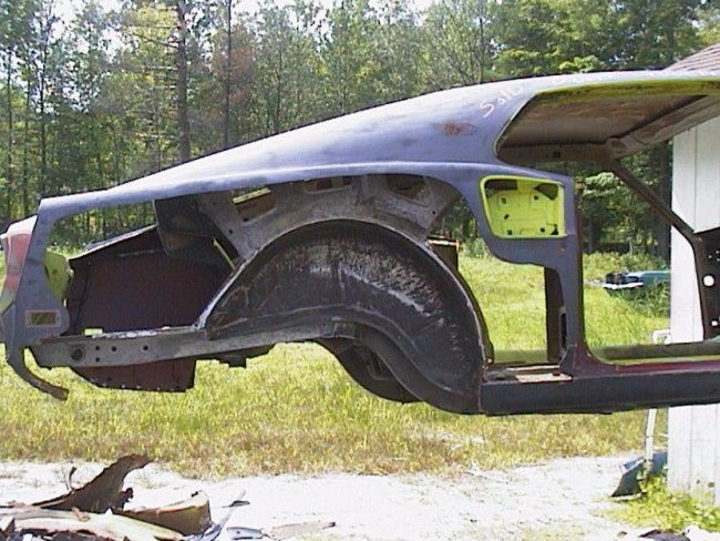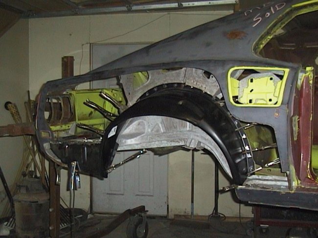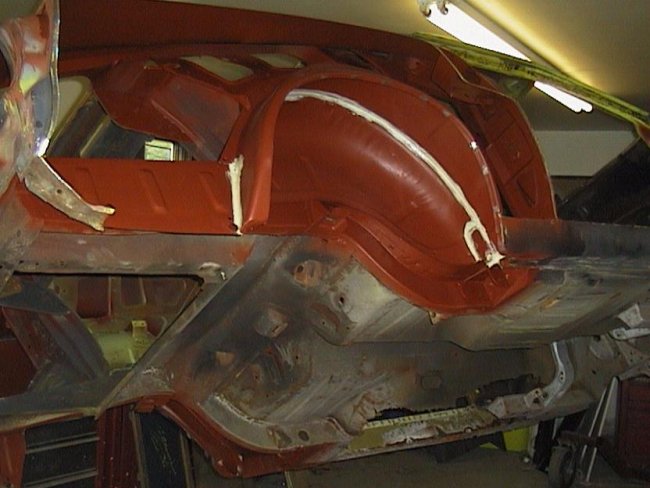 In this picture the remainder of the outer wheel well has been removed and lower trunk extension has been cut off. Prior to sandblasting the wheel well undercoating