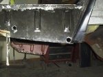 In this picture the new dropoff is already welded in place and the holes for the drain plug and backup light wires has been drilled. Only the small rectangular hole for the drain plug needs to me made. This is made by using a 1/4 drill bit to start the hole, a dremmel tool to make the hole square and a small flat file to even up the sides.