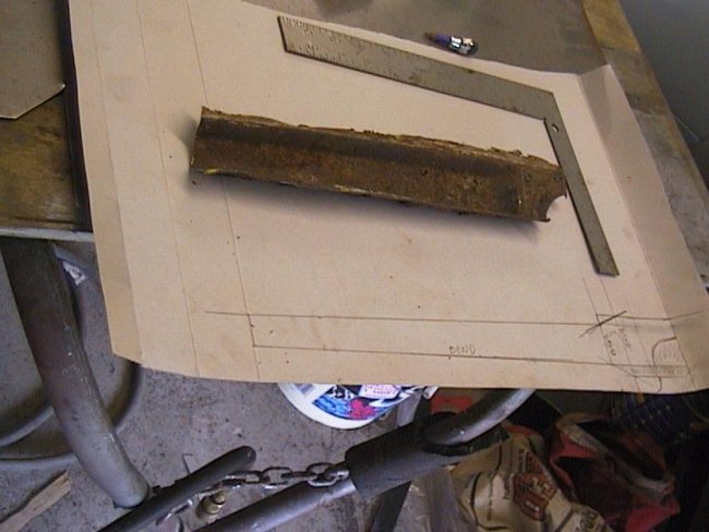 Before the repo quarter is trimmed at the bottom a new piece needs to be fabricated. This is done by first making a cardboard template. Luckily there was enough of the original piece left to use. In this picture you can see the original piece being used to make the template.