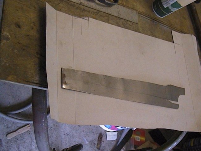 Then its time to create a duplicate of the final template using sheetmetal. The new pieces is cut-out trimmed and folded to match the origianal piece. One trick is to stack the new piece on top of the old one and use vise-grips and a hammer to adjust the new sheetmetal piece to fit the contours of the original.