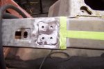 Next came the top patch. The patch was first butt-welded to the fender apron. Then it was clamped tight to the shocktower where it was plug-welded in place.