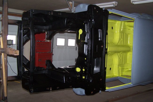 The next step in the process is to prime and paint the interior of the car body color, prime and paint the engine compartment semi-flat black and to prime the undercarriage. The undercarriage gets special detailing