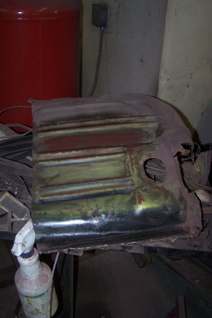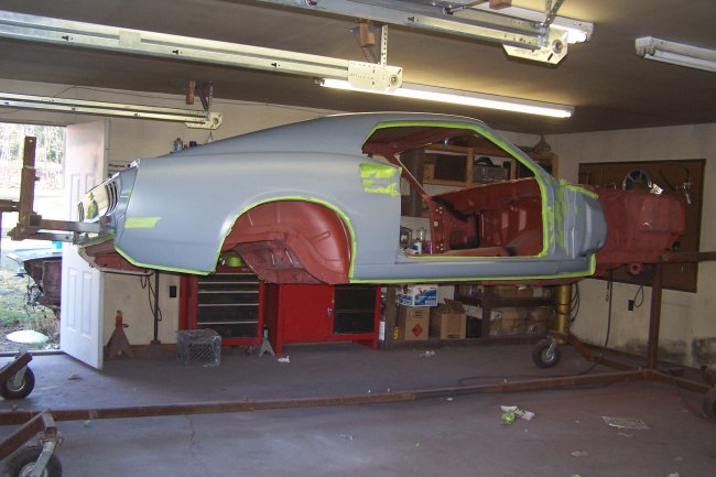 Here is shell after it has been block sanded and prepared for final primer. I blocked sanded the car with rigid rubber blocks and 220 grit paper, wet. Some areas