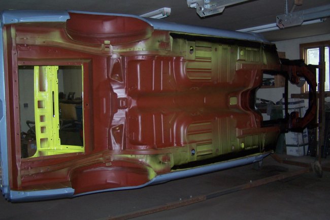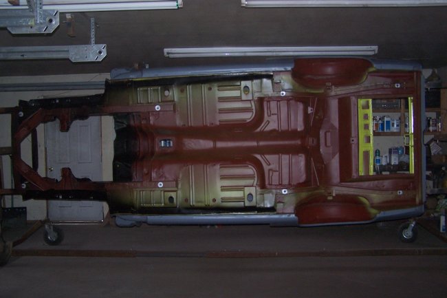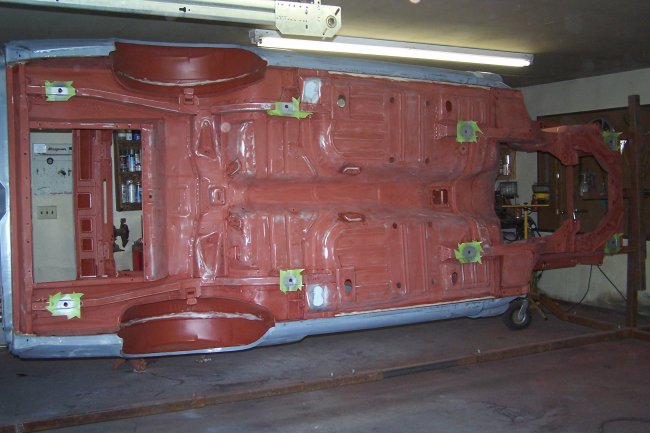 In this picture I removed the masking tape covering the areas of natural paint at the factory dolly mounting positions. Technically there were two more bare areas in the trunk and two more on the floorpan in the front, however I decided not to paint
